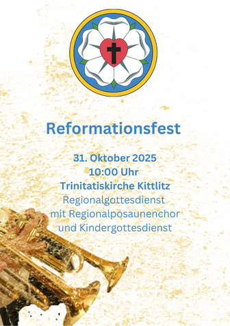 Wir laden am Reformationstag, den 31.10. 2025 zum Regionalgottesdienst nach Kittlitz ein. Los geht es 10.00 Uhr. Durch den Gottesdienst begleitet uns Pfr. Bublitz und der Regionalposaunenchor. Herzlich Willkommen.