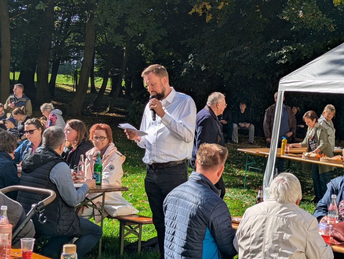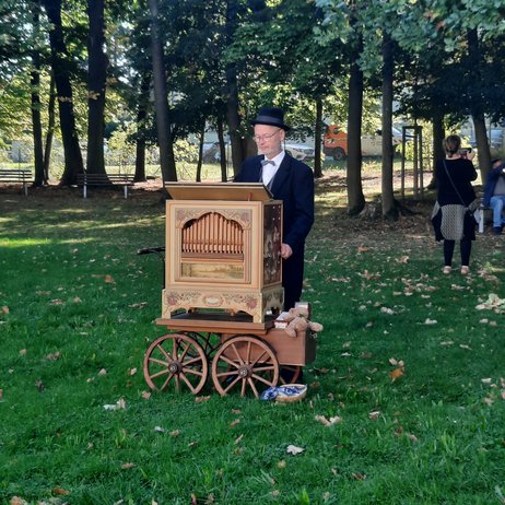 Im Anschluss verlagerte sich das Geschehen in den Schlosspark (fleißige Hände hatten schon alles vorbereitet), wo ein gemütliches Beisammensein in entspannter Atmosphäre stattfand. Untermalt von den Klängen einer Drehorgel gespielt von Gregor Hieke genossen die Gäste Speisen aus der Gulaschkanone, vom Grill oder Backblech und Getränke warm und kalt, führten angeregte Gespräche, hörten Worte von Pfr. Friedemann Bublitz zur Geschichte der Kittlitzer Kirche, sahen eine Tanzdarbietung von “AusdrucksStark“ (Bewegungs-und Tanztherapie), motiviert davon wurde mitgetanzt und alle ließen die Gemeinschaft hochleben.